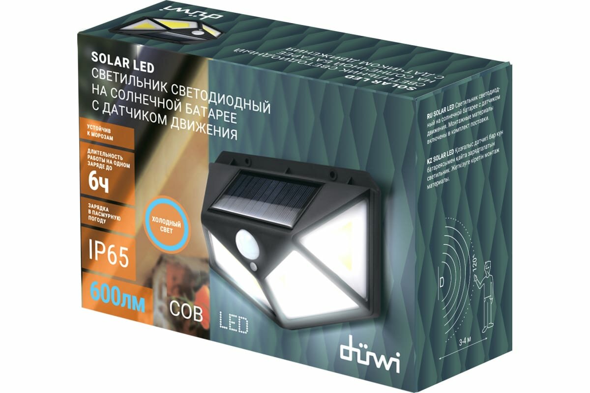 Светильник светодиодный с датчиком движения и освещения Solar LED на солнечных батареях, 10Вт, 6500К, 600Лм, IP65, цвет черный, duwi 25015 9