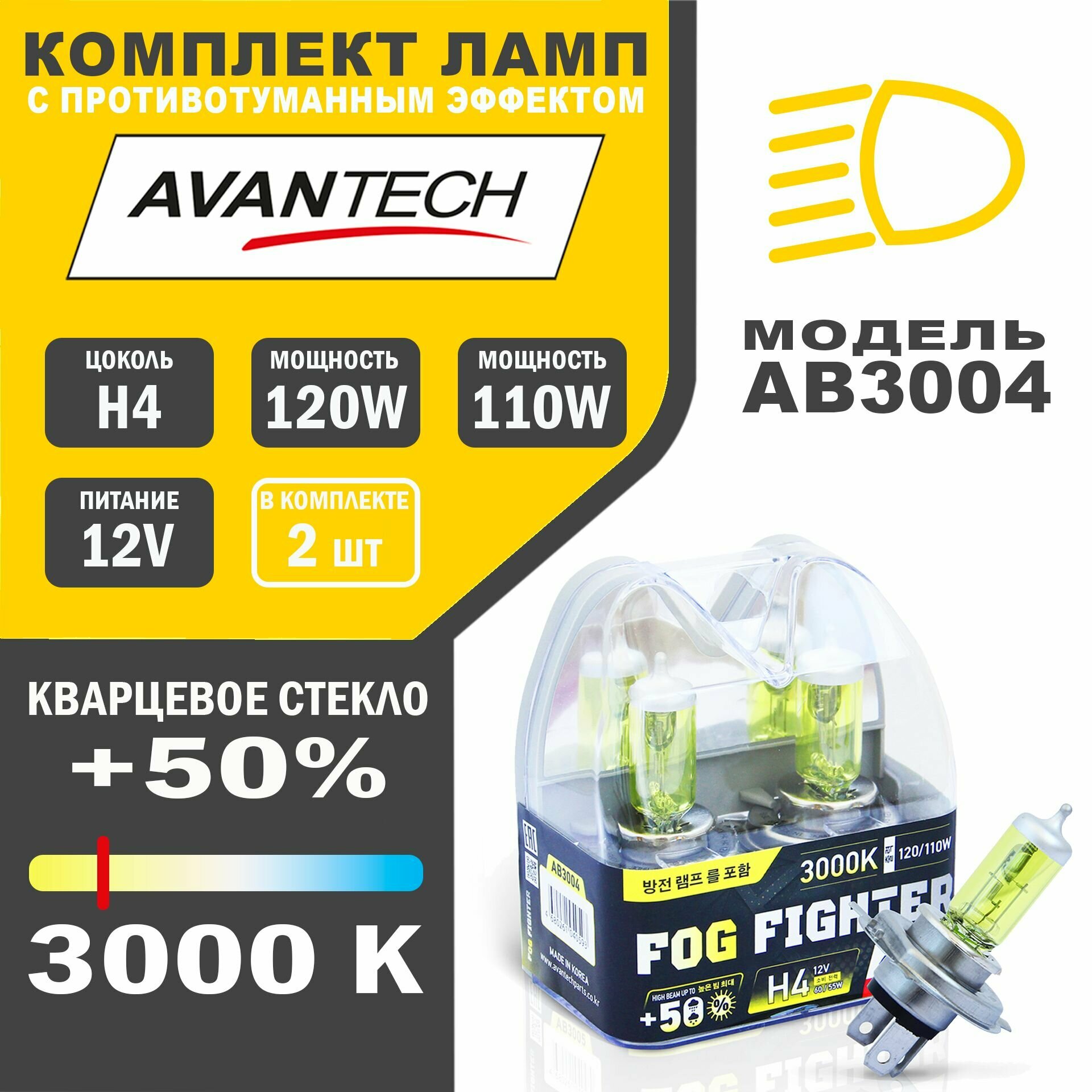 Купить Лампа автомобильная галогеновая высокотемпературная Avantech H4 12V 60/55W (120/110W) 3000K, комплект 2 шт. арт. AB3004