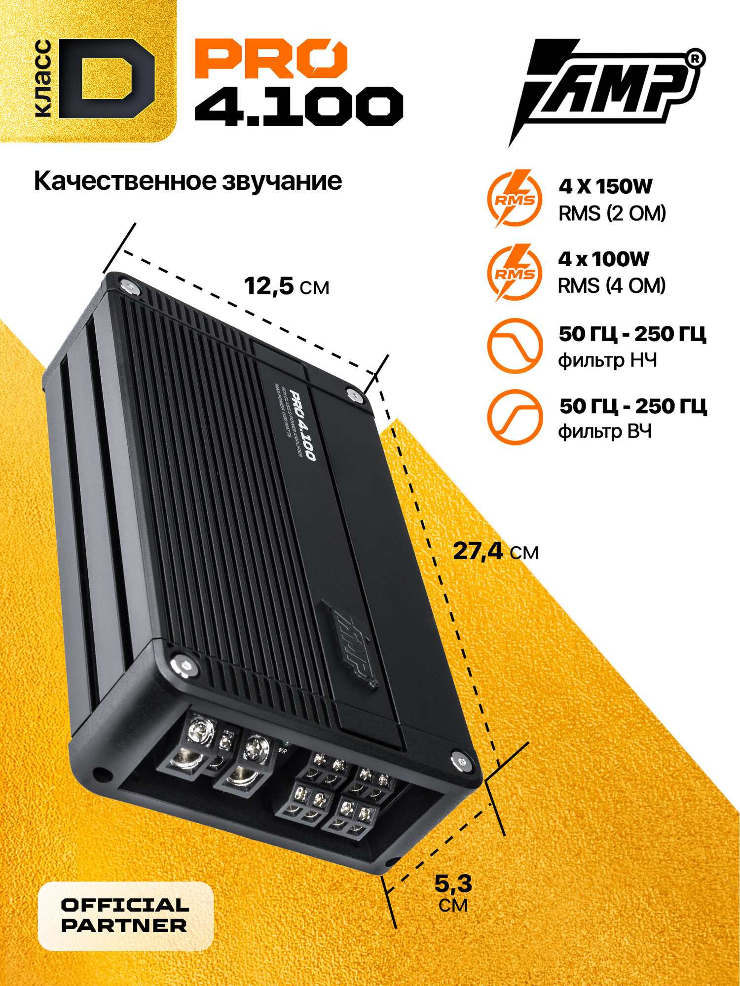 AMP PRO 4.100 Усилитель автомобильный; 4-х канальный class-D; max 1100w; min 2 Ом интересное:
