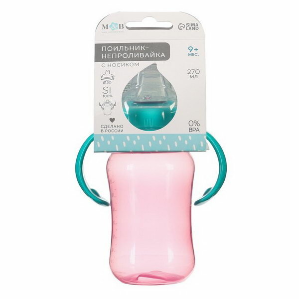 Купить Поильник - непроливайка детский M&B с мягким носиком, от 9 мес, 270 мл, с ручками, розовый/бирюзовый
