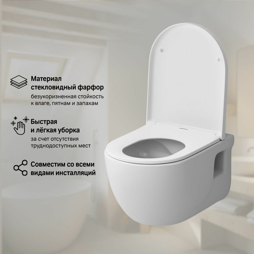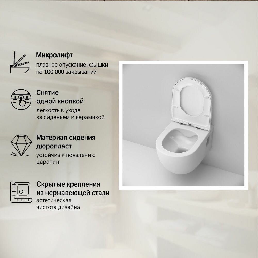 Унитаз подвесной AM.PM Chic C821701SC из премиального стекловидного фарфора,безободковый, с быстросъемным сиденьем микролифт, из дюропласта, гигиеничный и влагостойкий фарфор