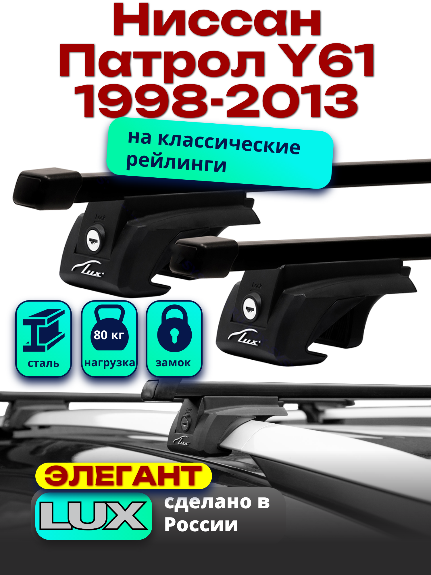 Багажник на крышу LUX элегант с замками, прямоугольные дуги 1,3м на Ниссан Патрол Y61 с рейлингами1998-2013, арт:215704