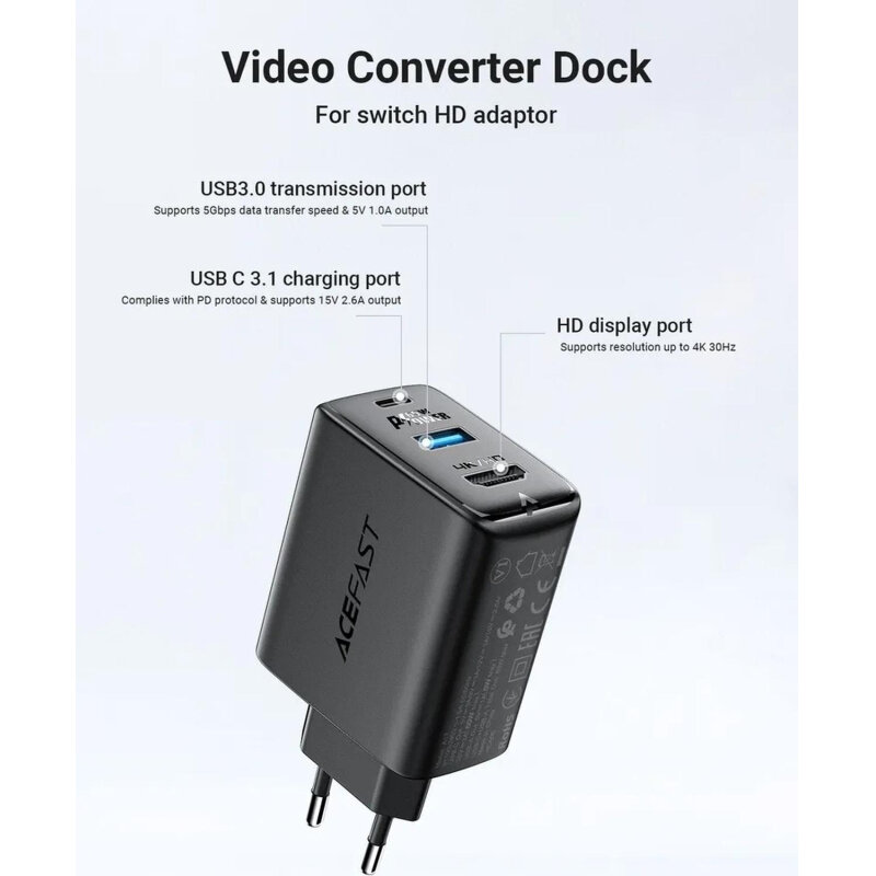 Мультифункциональное зарядное устройство ACEFAST A17 GaN 65W (Type-C PD60W + USB 3.0 5W + HDMI 4K@60Hz) + Кабель Type-C to Type-C 3.1, 1.8м, Черный