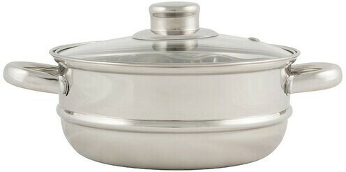 | Дополнительная информация | объем нижней чаши - 2,5 л, верхней чаши (дуршлаг) - 2 л; на внутренней части есть отметки литража; 3-слойное капсулированное дно - 201 нерж сталь+1 мм алюминий+430 сталь; крышка из жаропрочного стекла с отверстием для выпуска пара С-типа; материал корпуса и ручек - нержавеющая сталь |