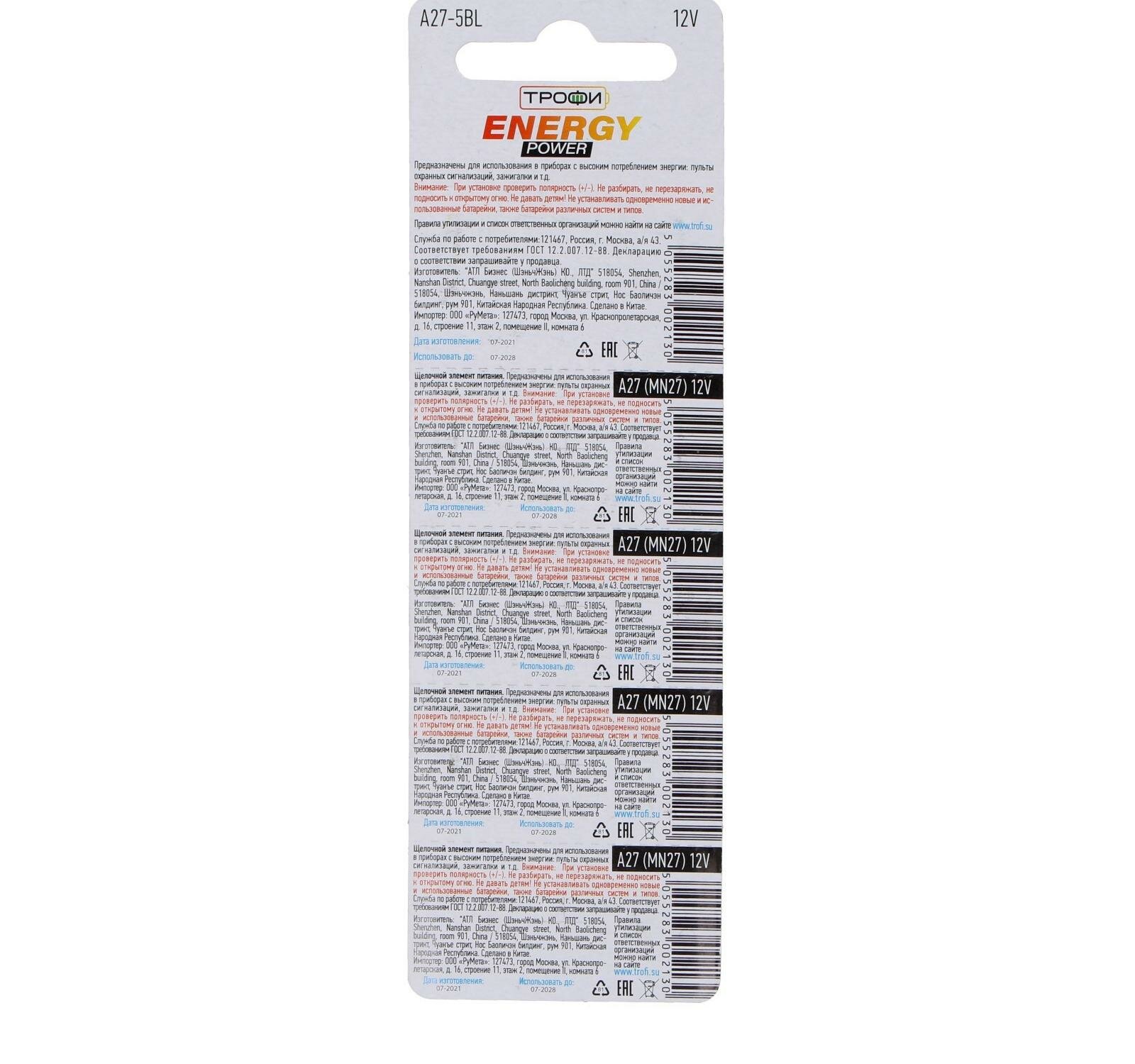 Батарейки Трофи A27-5BL ENERGY POWER Alkaline арт. C0034939 (5 шт.)
