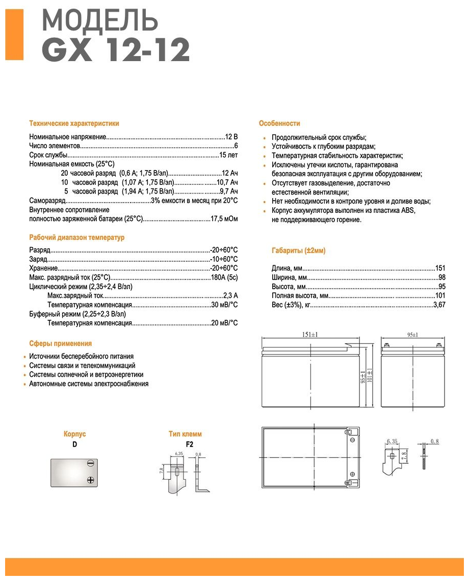 Аккумуляторная батарея Delta GX 12-12 напряжение 12В, емкость 12Ач (151х95х101mm) интересное:
