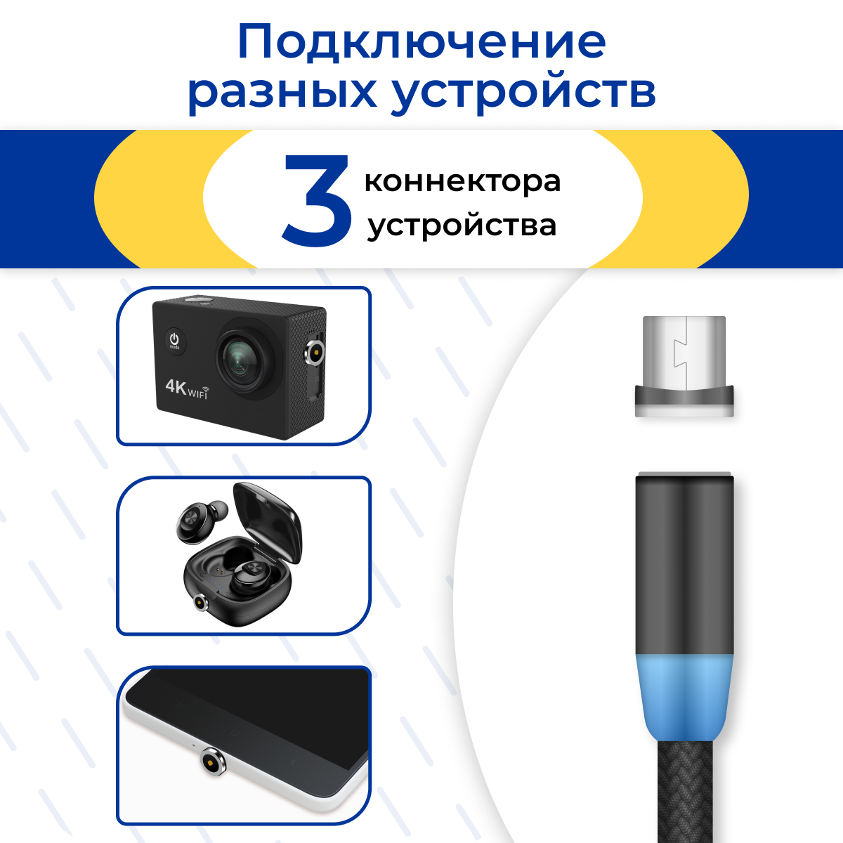 Магнитный кабель для зарядки 3 в 1, Type-C, Lightning, Micro USB / Провод на iPhone, Samsung, Android / Шнур 1 метр