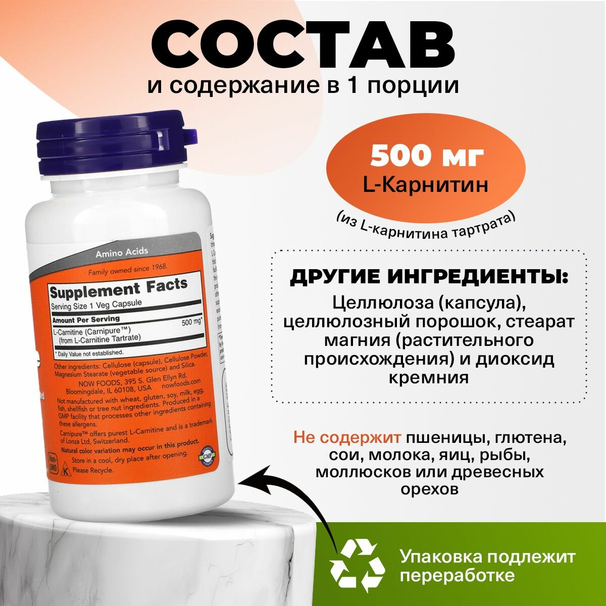 Купить NOW L Carnitine 500mg, Л карнитин, 60 раст капсул, Спортивное питание, жиросжигатель для похудения, для выносливости