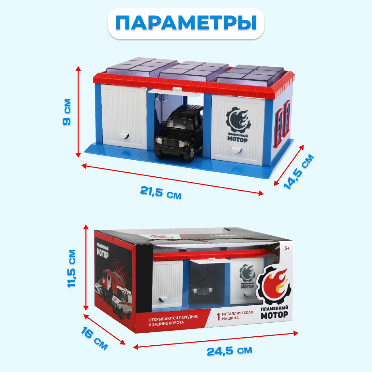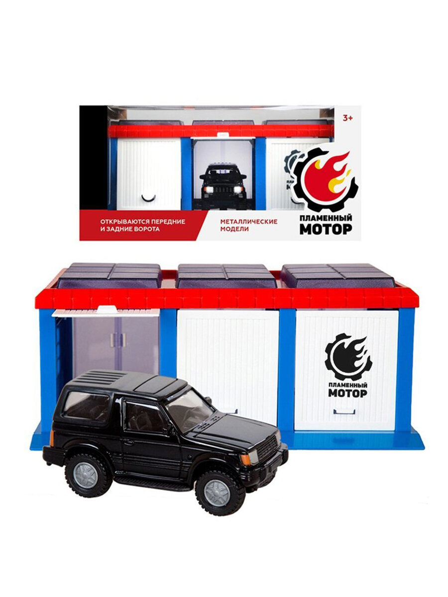 Гараж Пламенный мотор Город, открываются передние и задние ворота, джип металлический 1:43 (870271)