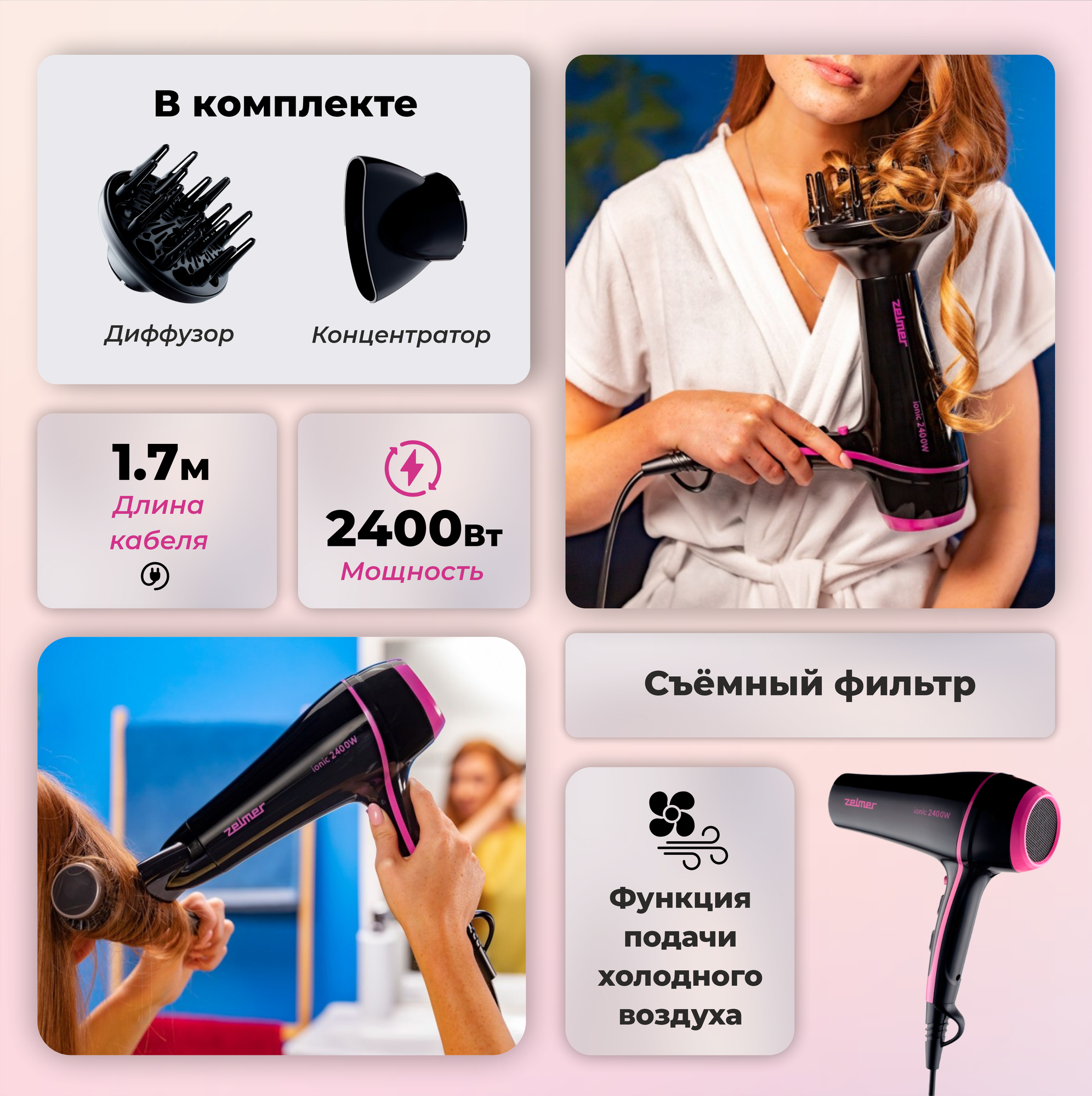 Купить Фен ZELMER ZHD8360 , ионизация, 2400Вт, 3 режима, петля для подвешивания