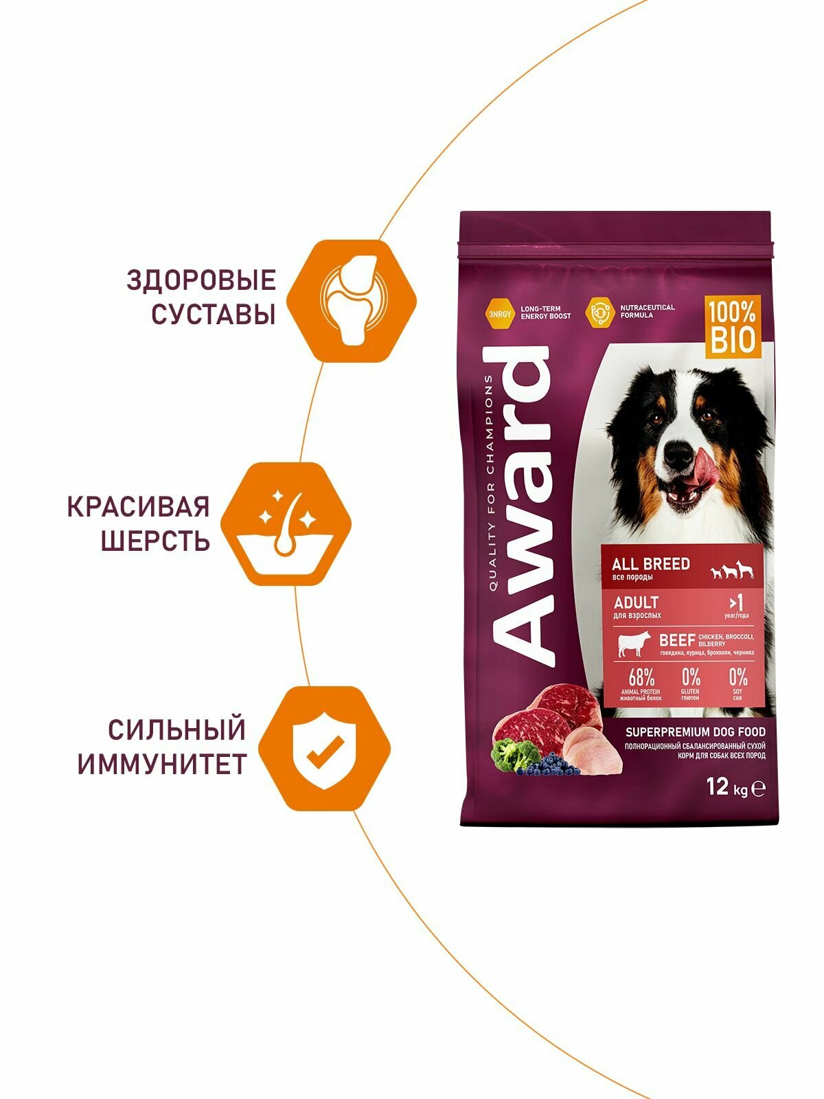 Купить Сухой корм AWARD для взрослых собак всех пород с говядиной и курицей с добавлением брокколи и черники 12кг