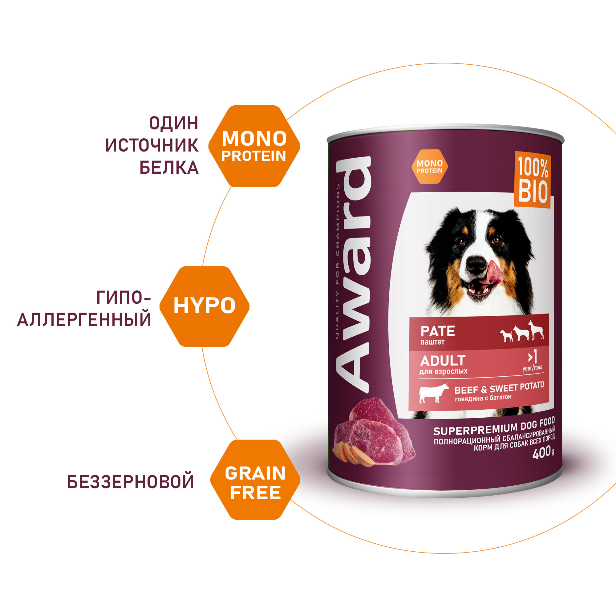 Купить AWARD Влажный корм для взрослых собак паштет из говядины с бататом 400г