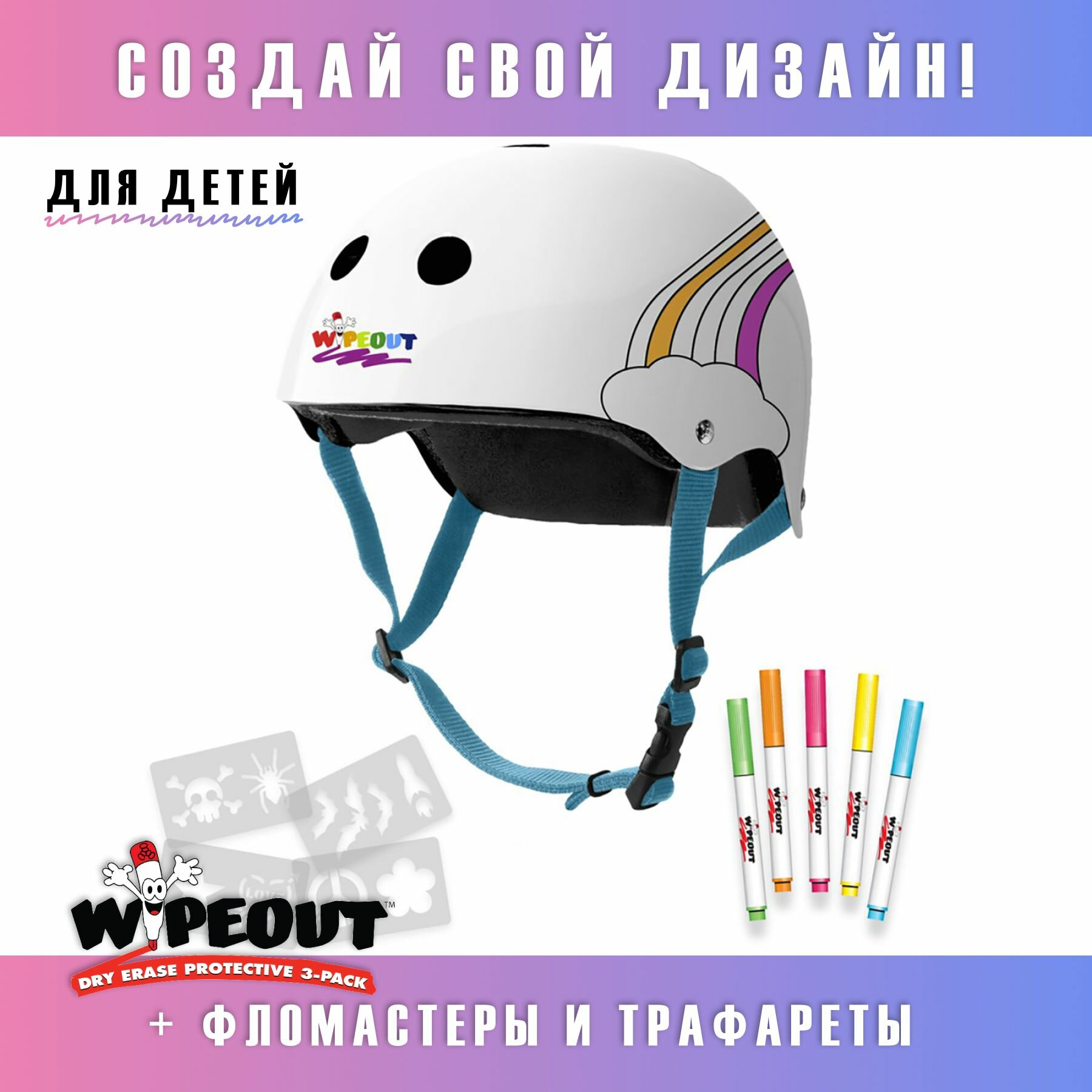 СохранитьШлем для детей и подростков Wipeout White Rainbow, с фломастерами - белый. Размер M (5+), обхват головы 49-52 см. интересное: