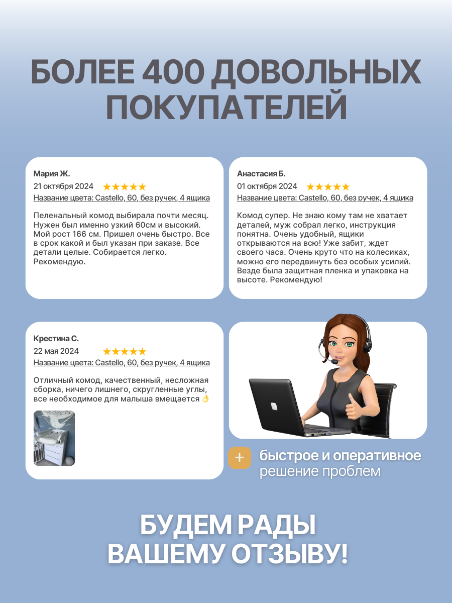 | Плюсы: | Хороший комод, соответствует описанию. Удобный верхний пеленальный столик с ограничителями и местом для мелочей |