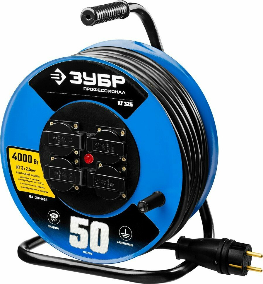 ЗУБР 55079-50 КГ 325 удлинитель на катушке, 50 м, 4000 Вт, 4 гнезда, IP44, КГ 3х2,5 кв мм, Профессионал