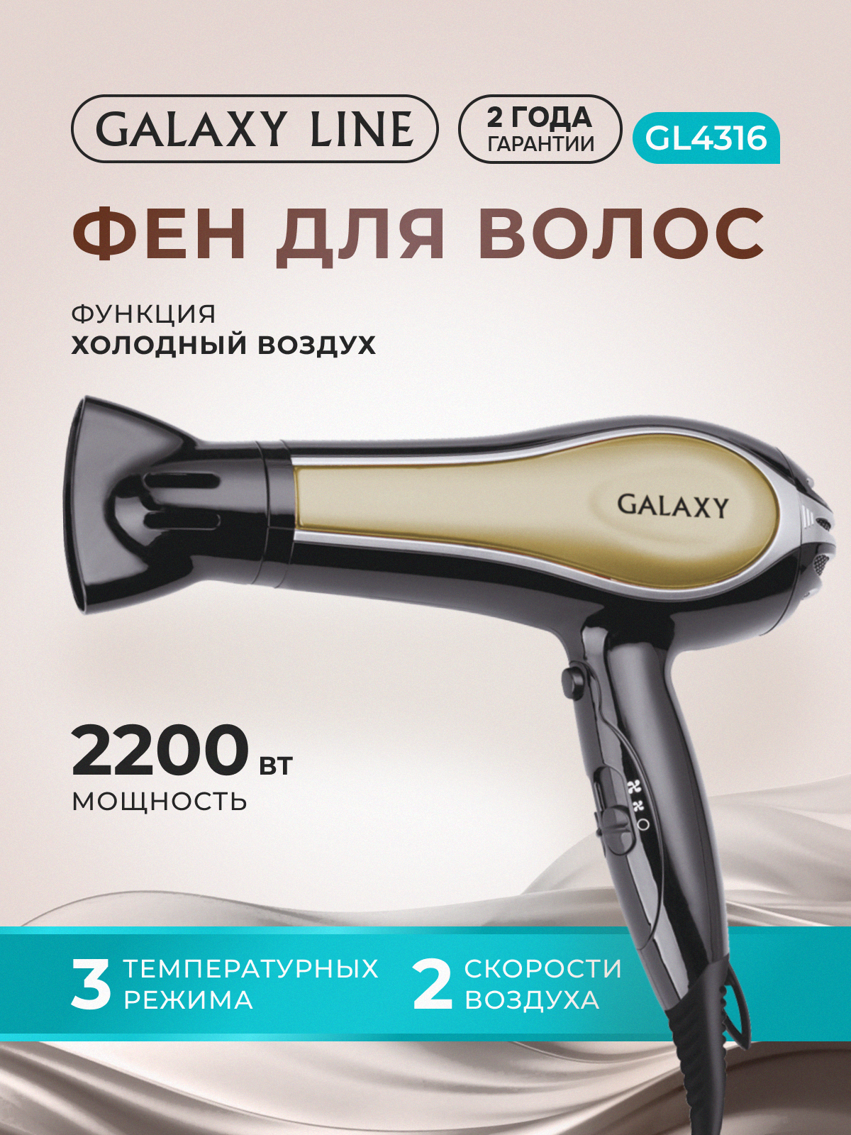 Купить Фен GALAXY LINE GL4316, мощность 2200Вт, 3 температурных режима, черный/бежев