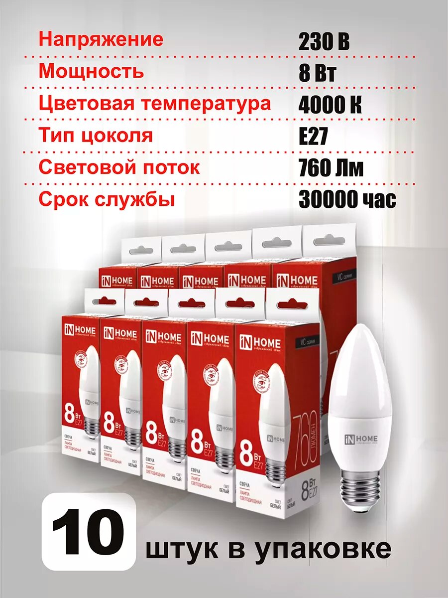Купить Лампа светодиодная IN HOME LED 8Вт 230В Е27 4000К 760Лм, свеча, нейтральный белый, 10 шт