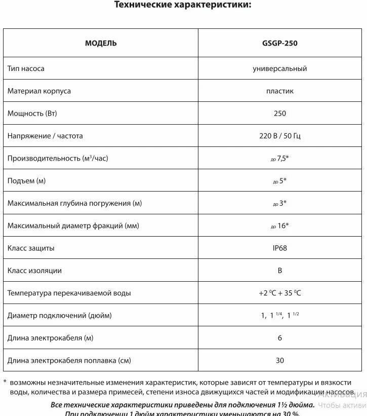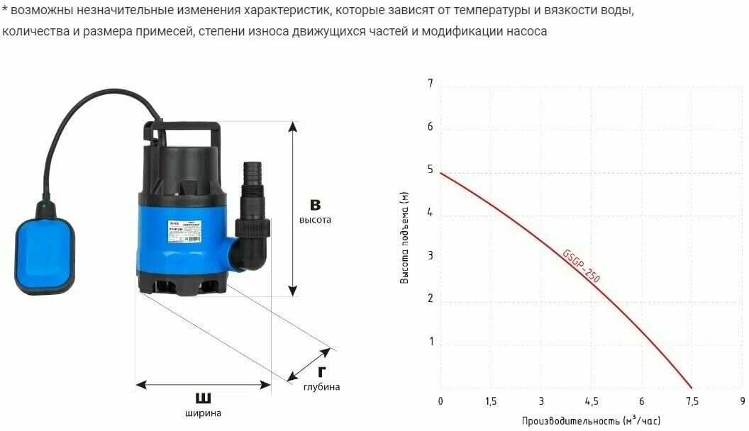 Насос дренажный, Jemix, 6 м, 250 Вт, погруж3 м, напор5 м, 7.5 м³/ч, GSGP-250
