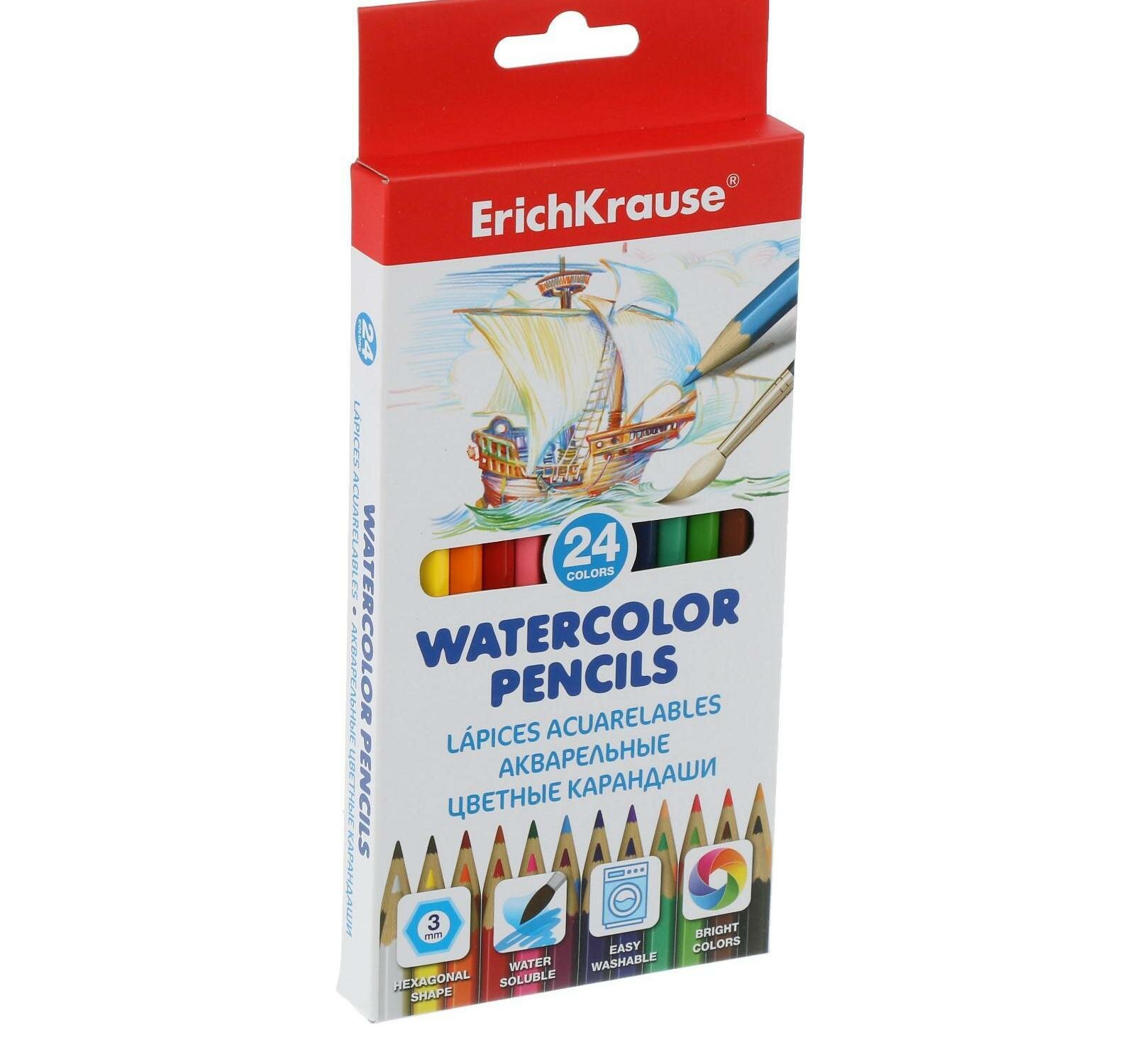 Купить Акварельные карандаши деревянные ErichKrause шестигранные, грифель 3 мм, 24 цвета с кисточкой 50534