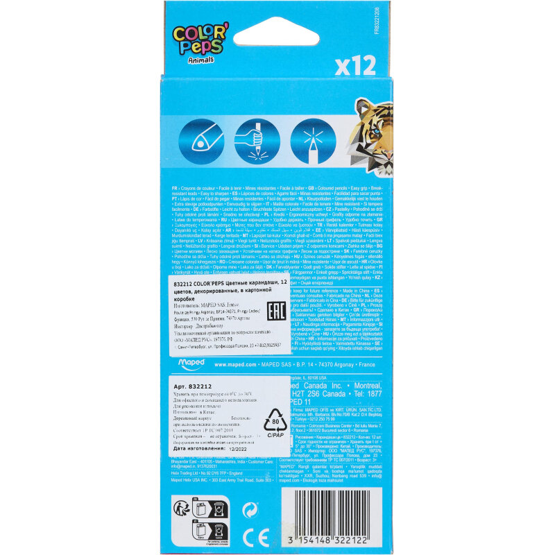 Карандаши цветные 12 цветов Maped Color'Peps Animals (L=175мм, D=7мм, d=3мм, 3гр) картонная упаковка (832212)