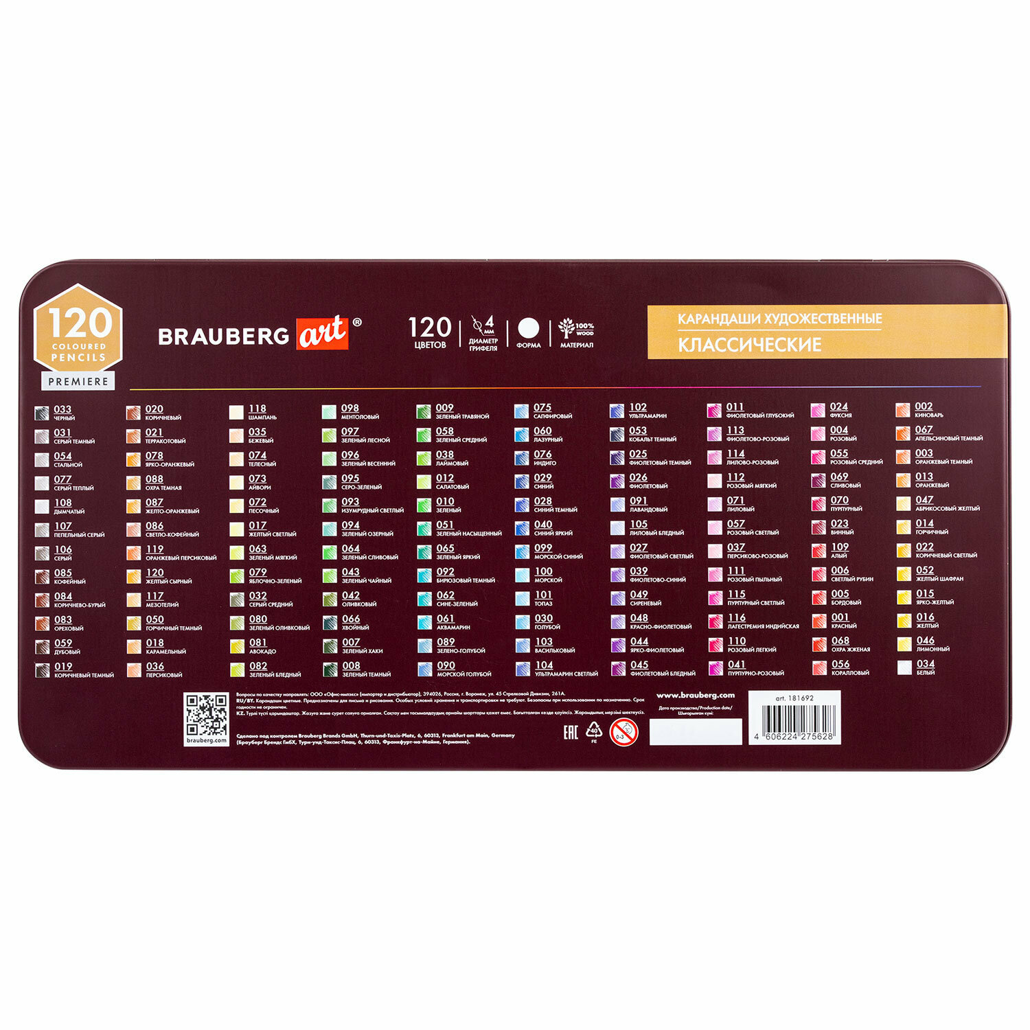 Карандаши художественные цветные BRAUBERG ART PREMIERE, набор 120 цветов, 4 мм, металл кейс, 181692