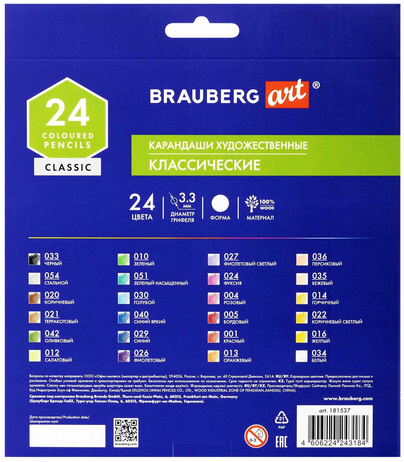 Карандаши художественные цветные BRAUBERG ART CLASSIC, 24 цвета, мягкий грифель 3,3 мм, 181537 (арт. 181537)