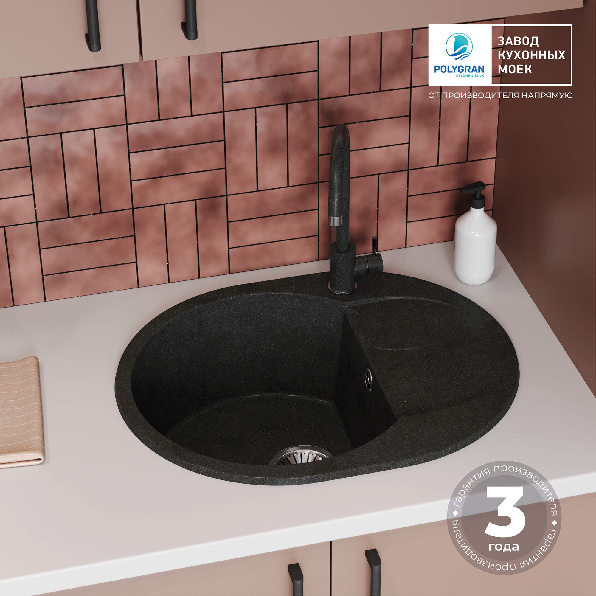 Мойка для кухни каменная POLYGRAN ATOL-620, черная, врезная, круглая, с крылом (№16 Черный)