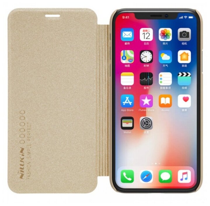 Чехол-книжка для iPhone X / XS Nillkin Sparkle шершавая, износостойкая, цв. золотой интересное: