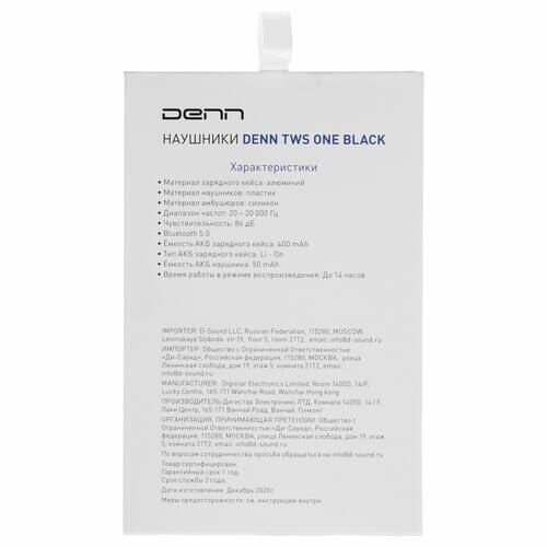Гарнитура DENN TWS One Black DTS-01B, Bluetooth, черный
