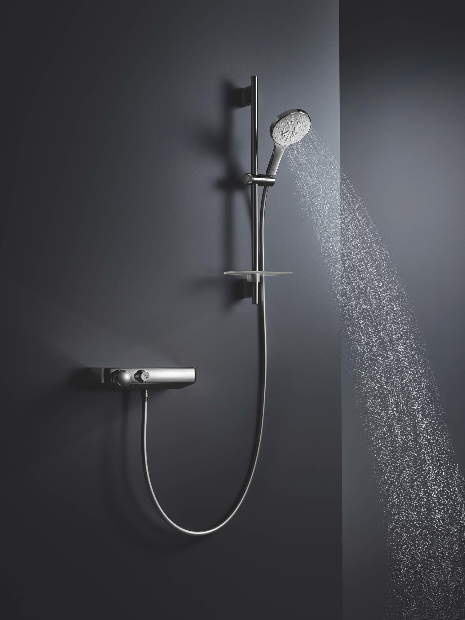 | Комплектация | ручной душ Rainshower SmartActive 130 (26 574) / душевая штанга 600 мм с металлическими настенными креплениями / душевой шланг 1750 мм (28 388 000) / Полочка GROHE EasyReach |