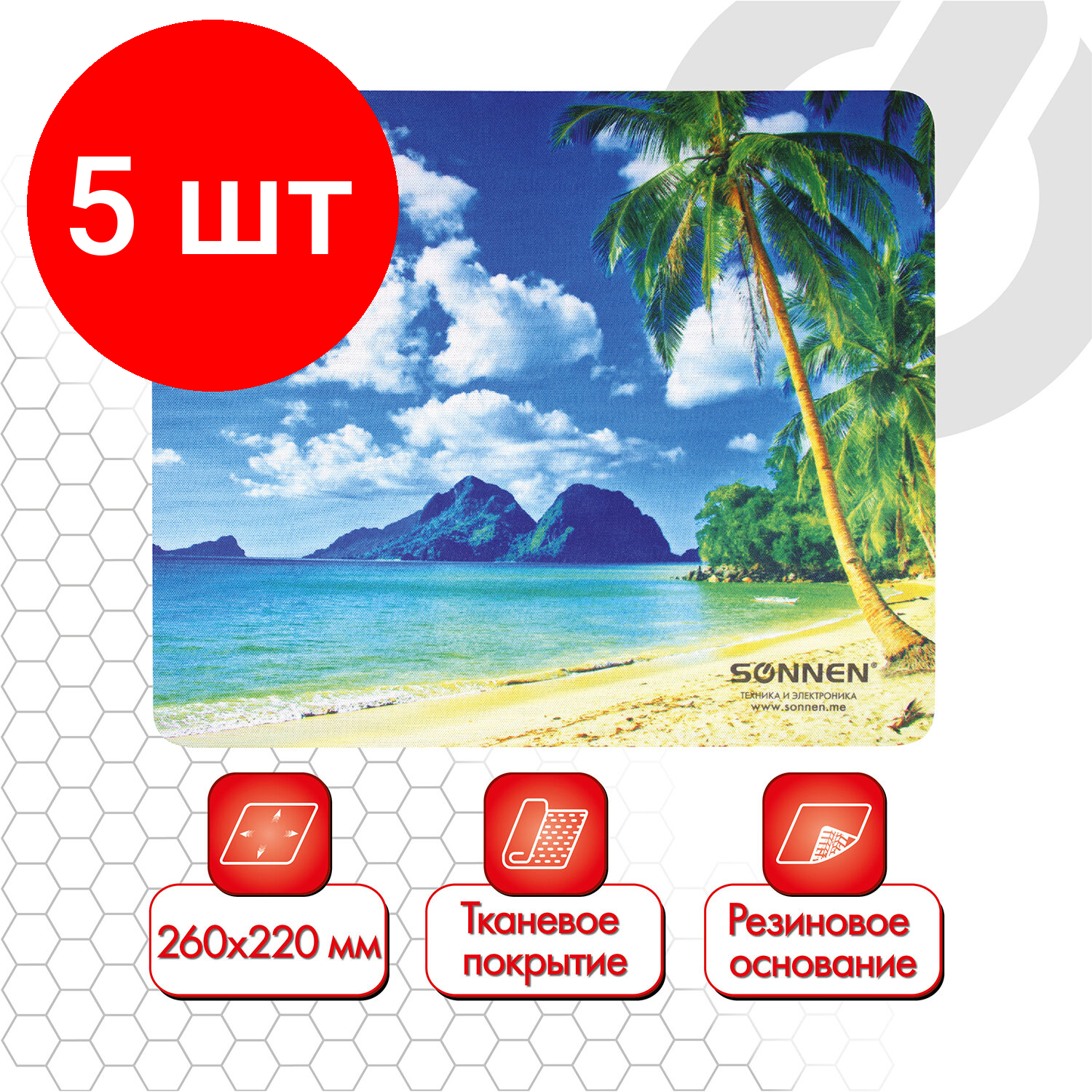 Комплект 5 шт, Коврик для мыши SONNEN "BEACH", резина + ткань, 260х220х3 мм, 513294 интересное: