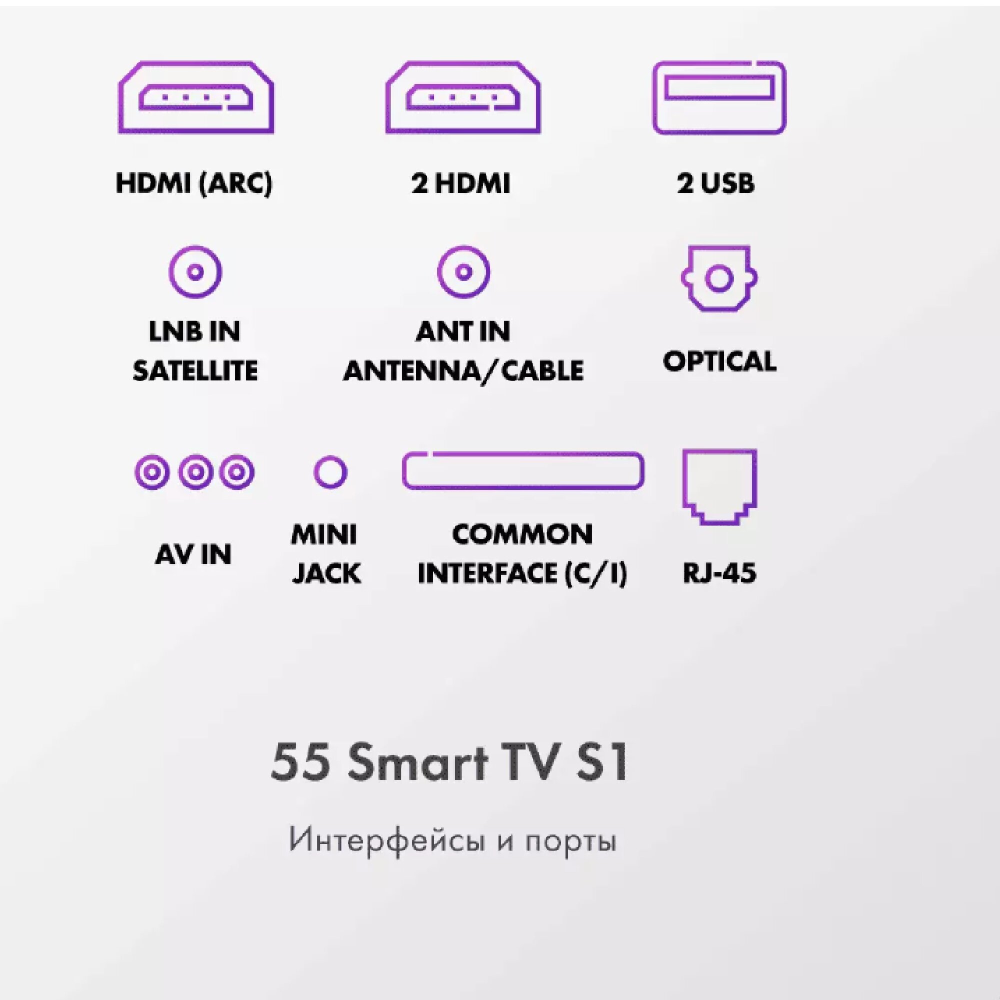 | Разъемы и интерфейсы | Ethernet - RJ-45 / USB Type-A x 2 / вход HDMI x 3 / вход аудио оптический / выход на наушники / композитный видеовход / слот CI/CI+ |