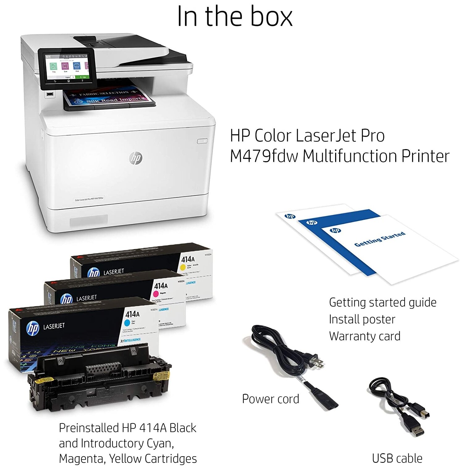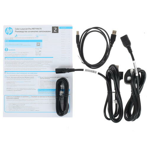 | Комплектация | HP Color LaserJet Pro M479fdw, 4 предустановленных лазерных картриджа HP LaserJet (черный - 2400 страниц, стартовые: голубой, пурпурный, желтый - 1200 страниц), документация в комплекте (руководство по началу работы, инструкция по установке), гарантийный талон, кабель питания, кабель USB, кабель для факса. |