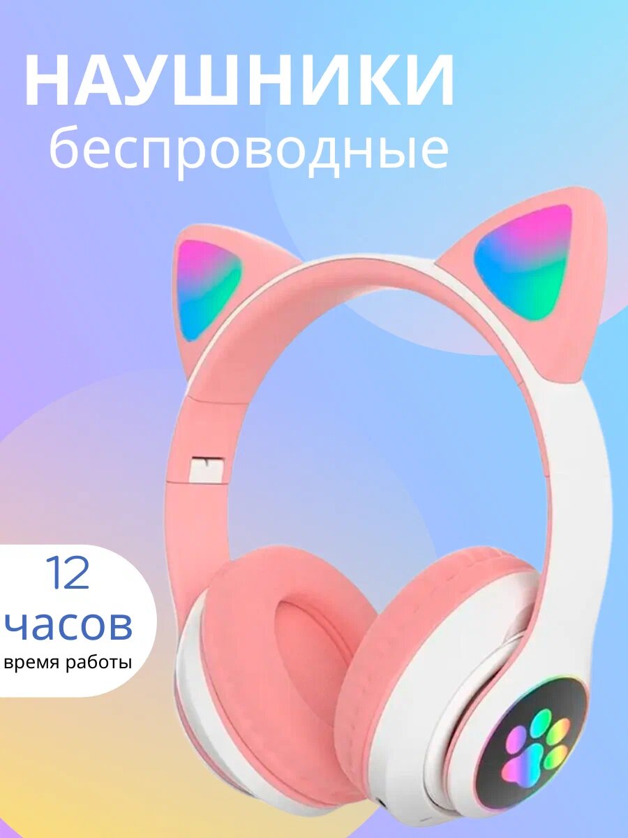 Наушники беспроводные детские с ушками / Светящиеся детские беспроводные наушники с ушками / Беспроводные наушники детские / Наушники с ушами розовые