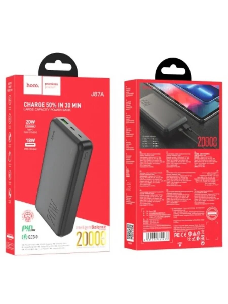 Внешний аккумулятор Hoco J87A, 20000 mAh, 20W, QC3.0, LED индикатор, цвет черный, 1 шт
