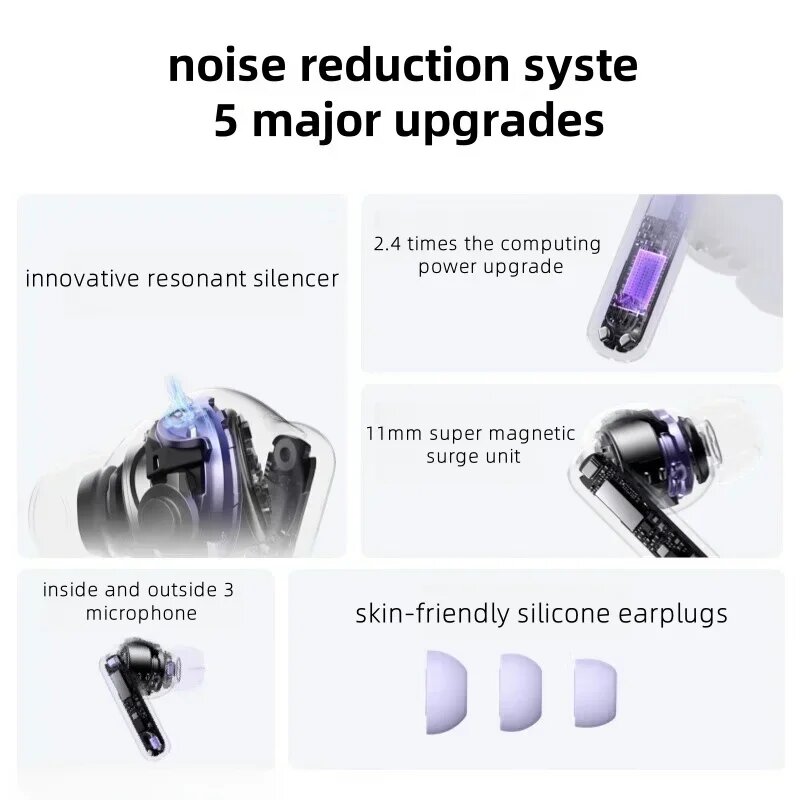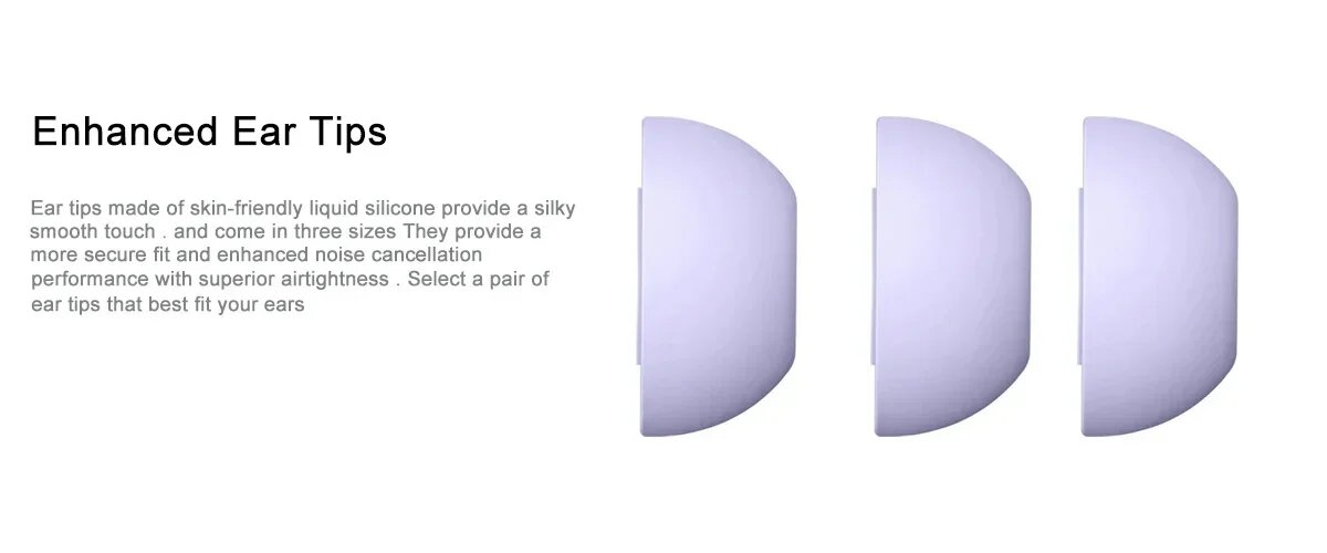 | Комплектация | наушники, зарядный чехол, 3 пары силиконовых насадок разных размеров (большие, средние, маленькие), кабель для зарядки USB-C, краткое руководство, гарантийный талон |