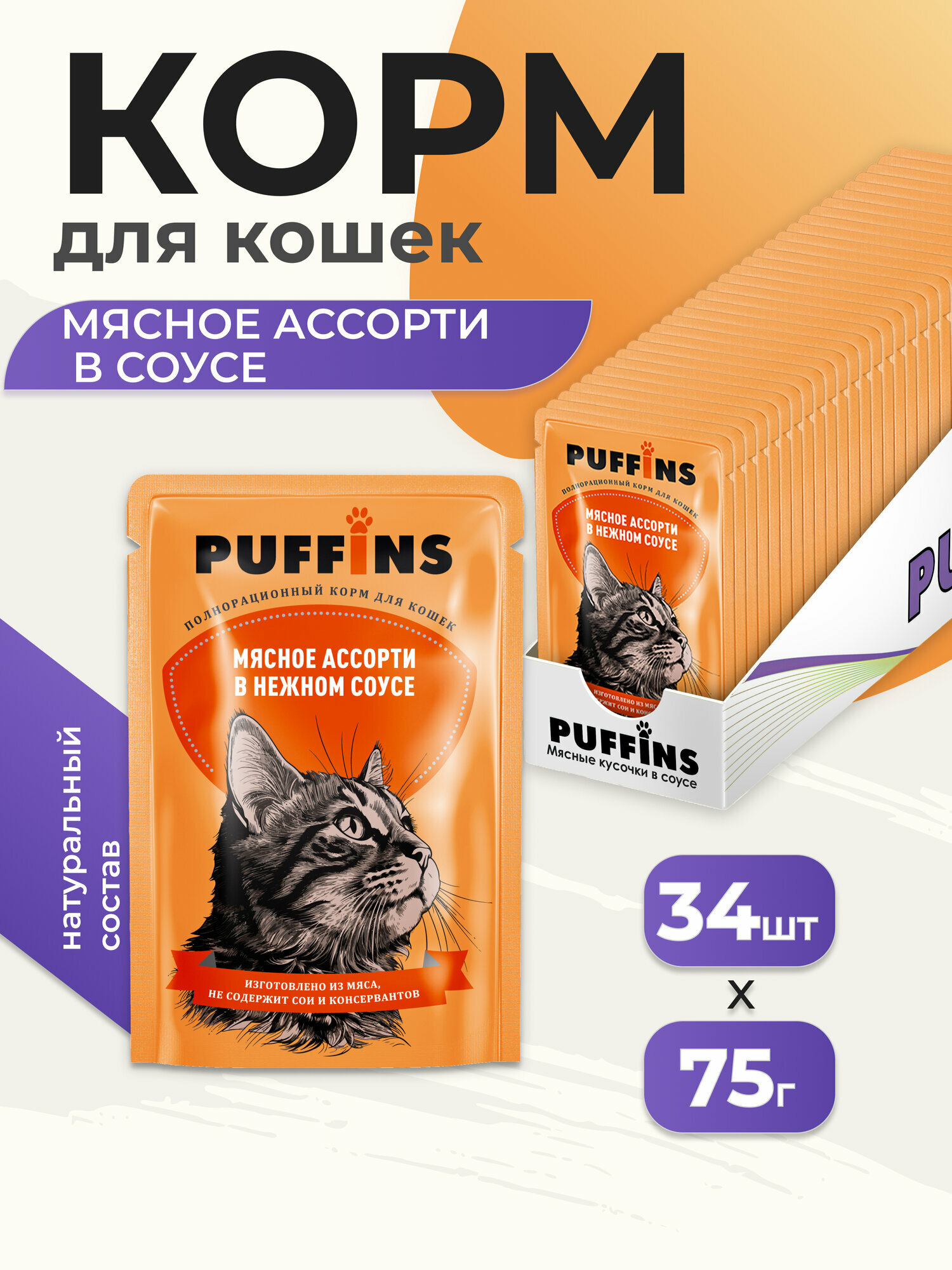 Купить Корм для кошек влажный Puffins полнорационный, Мясное ассорти в соусе, 34 шт по 75 гр