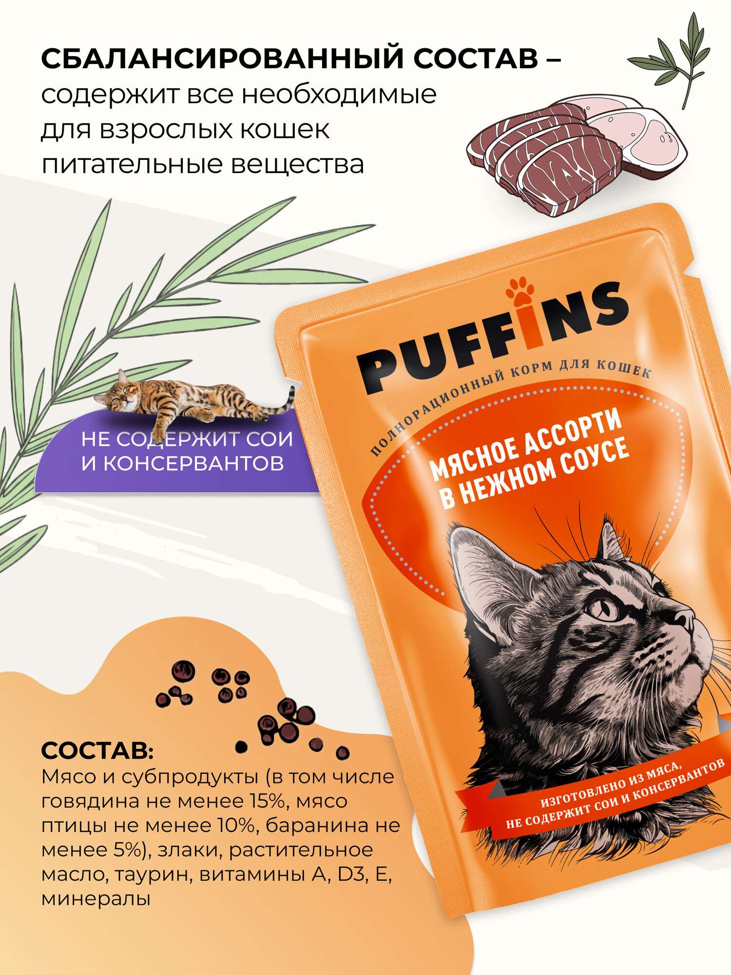 Корм для кошек влажный Puffins , мясное ассорти в соусе, 24 шт по 100 гр