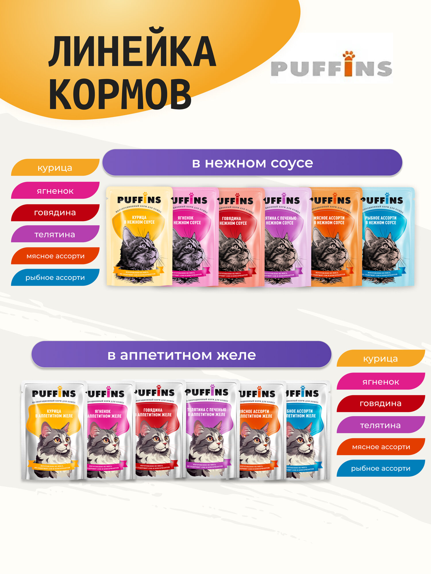 Корм для кошек влажный Puffins , мясное ассорти в соусе, 24 шт по 100 гр