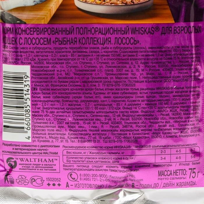 WHISKAS рыбная коллекция для взрослых кошек с лососем в желе пауч 75 гр 75 гр х 8 шт
