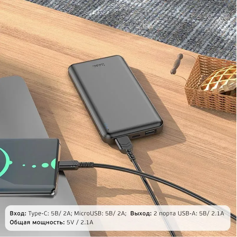 Внешний аккумулятор 10000 mAh Hoco J100 (2USB/2.1A/input Micro/Type-C/LED инд.бат) черный