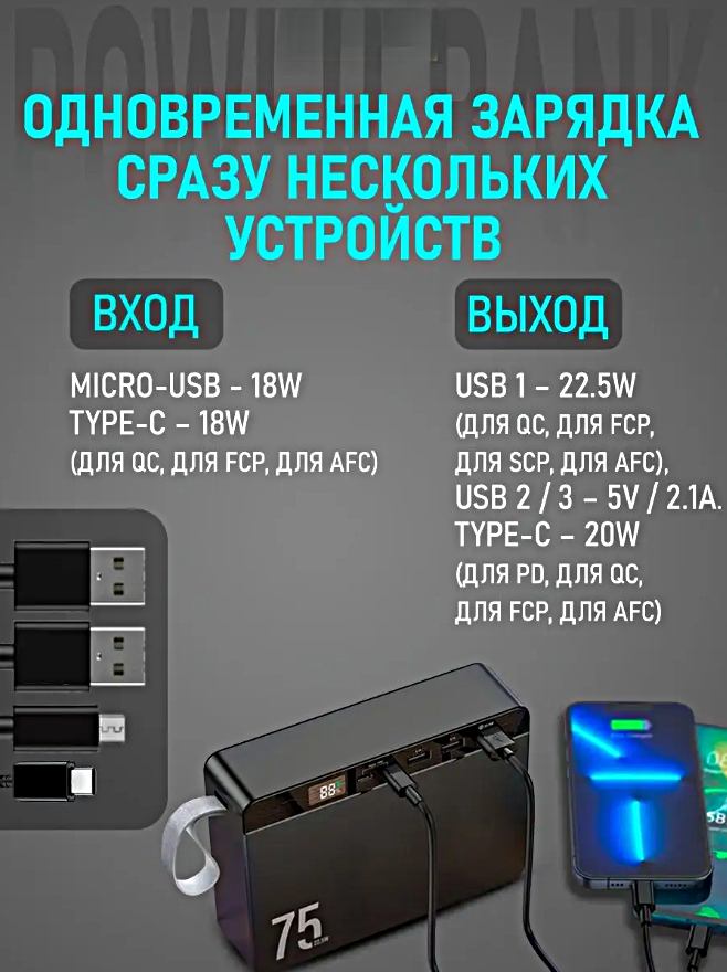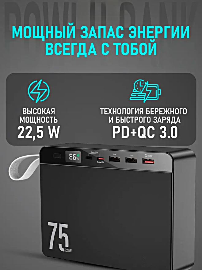 СохранитьПортативный внешний аккумулятор J94 POWER BANK 75000 mAh, Быстрая зарядка, Черный интересное:
