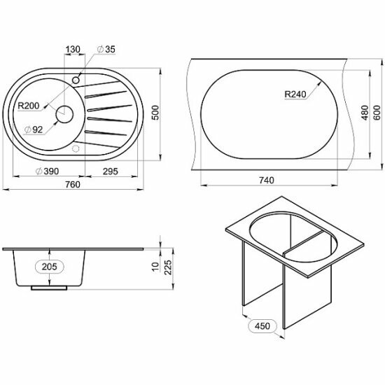 Кухонная мойка кварцевая Granula ST-7601 овальная с крылом, стандарт, чаша D 390, цвет базальт (7601bt)