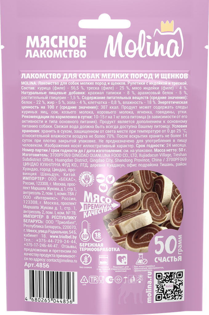 Купить Лакомство для собак мелких пород и щенков, Рулетики с индейкой и треской, 50 г MOLINA