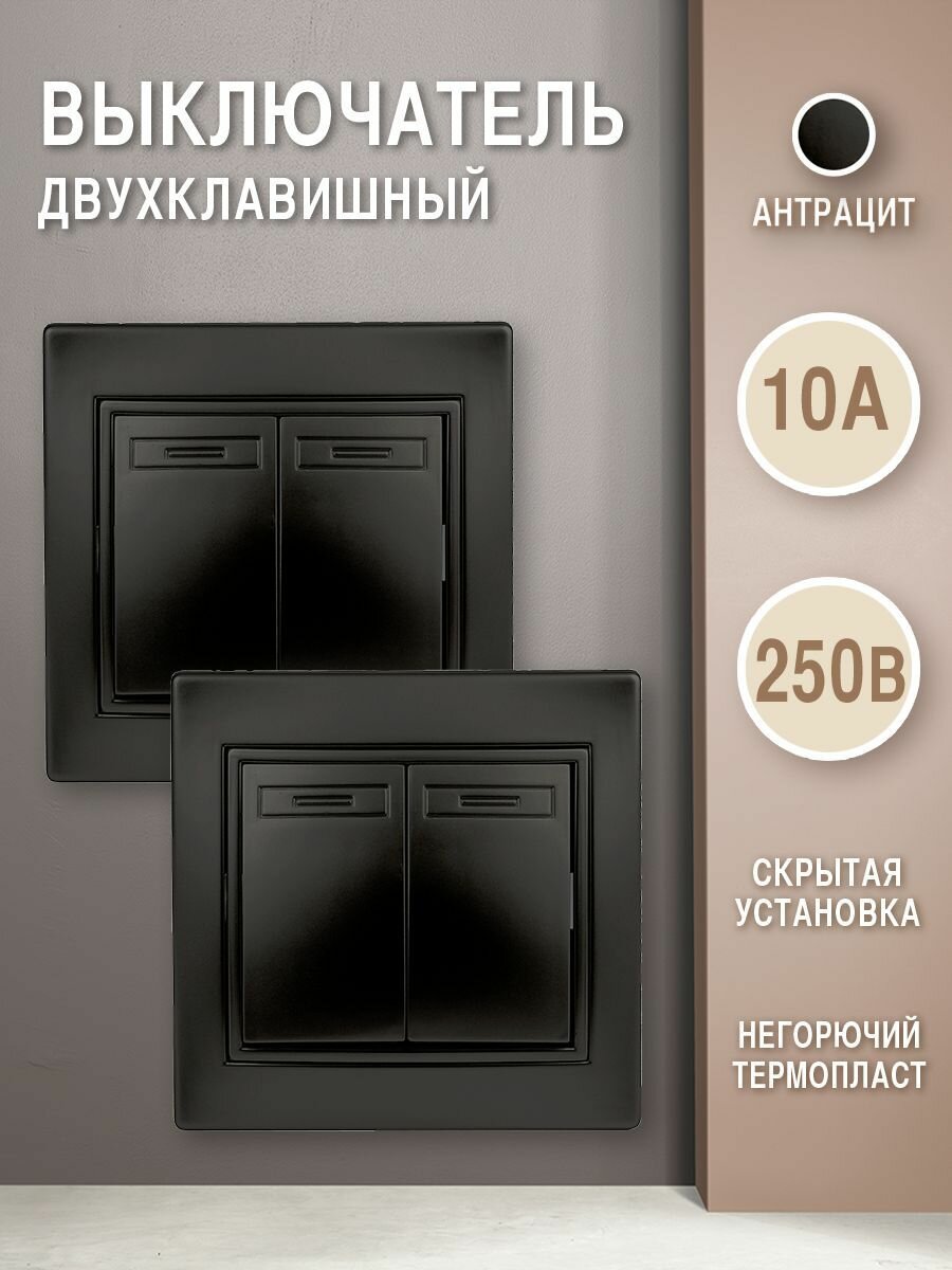 Выключатель двухклавишный (комплект 2 шт.), 10А-250В, IP20, СУ, антрацит