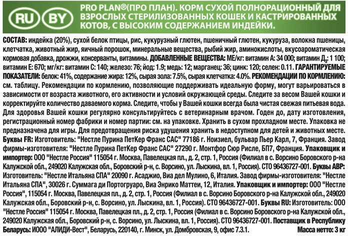 Сухой корм Pro Plan для стерилизованных кошек и кастрированных котов, с высоким содержанием индейки, Пакет, 10 кг + 2 кг. (12кг.)