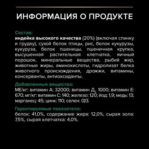 | Состав | индейка (20%), сухой белок птицы, рис, кукурузный глютен, кукуруза, пшеничный глютен, волокна пшеницы, клетчатка, яичный порошок, минеральные вещества, рыбий жир, животный жир, консерванты, вкусоароматическая кормовая добавка, дрожжи, витамины, аминокислоты |