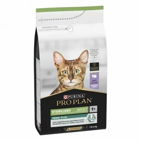 Купить PRO PLAN Sterilised Adult Renal Plus Сухой корм для поддержания здоровья почек у стерилизованных кошек и кастрированных котов, с индейкой, 1,5 кг