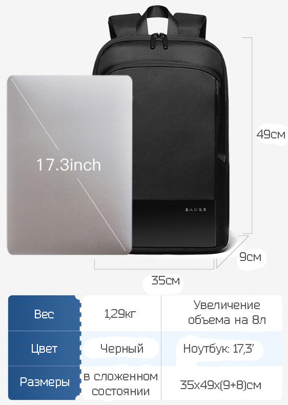 Рюкзак Bange BG-77115L, городской, с расширением до 28 л, черный, для ноутбука 17,3 интересное:
