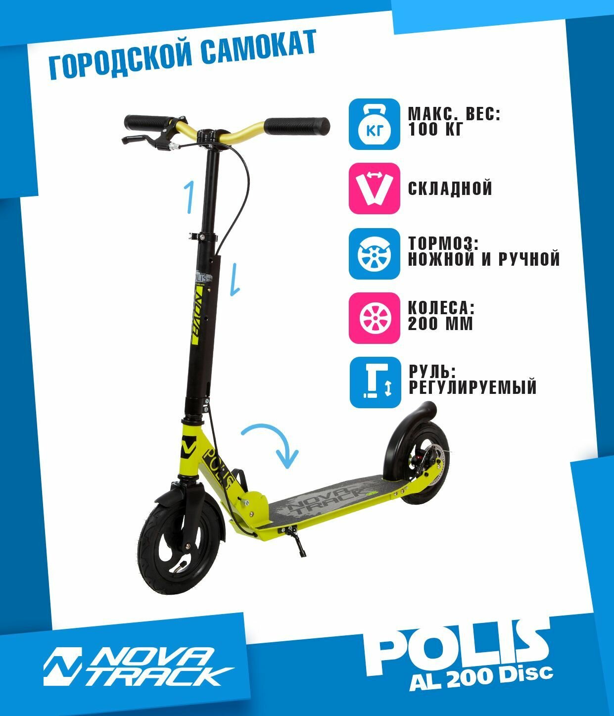 Самокат Novatrack POLIS AL 200 Disc (2021) (Самокат для детей NOVATRACK POLIS с ручным дисковым тормозом, алюм., складной, эргономичный Y-руль с)